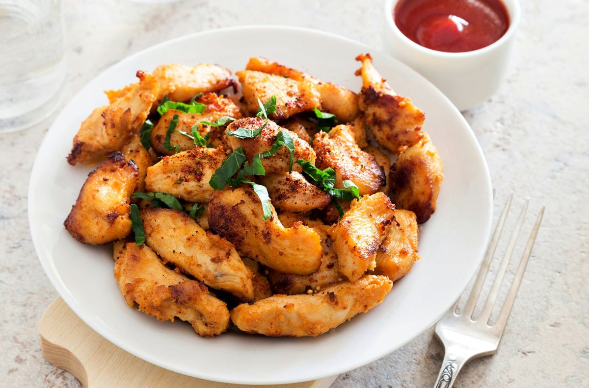 Pentru a te asigura că puiul rămâne suculent, nu-l găti prea mult timp. Poți testa gătirea bucăților de pui tăind una la mijloc – dacă este albă și sucurile curg clare, este gata.